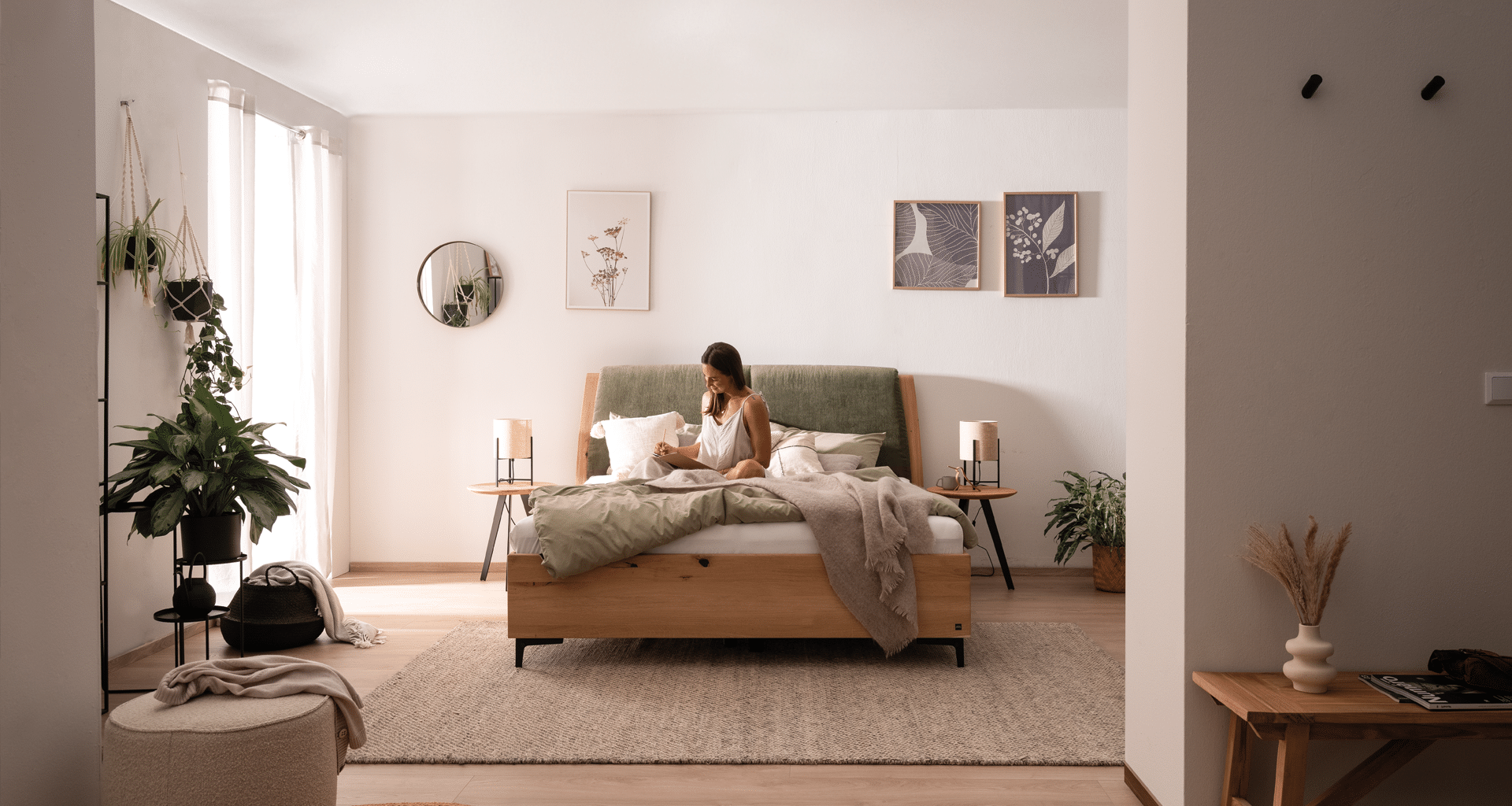 Natürlich, sorgfältig verarbeitet und mit modernen Schlafsystemen, die sich individuell an deinen Körper anpassen, erfüllen unsere Holzbetten alle deine Wünsche an hervorragenden Schlafkomfort. Aber auch optisch sorgen sie für dein Wohlbefinden. Denn wir halten für jeden Geschmack die richtige Ruheoase bereit. Design-Liebhaber werden sich zum Beispiel beim Bett “Grand Nobile” sofort zu Hause fühlen. So scheint der geradlinige Bettrahmen aus Eiche, Wildeiche, Zirbe oder Wildkernbuche zu schweben und zieht mit seinem markanten Haupt die Blicke auf sich. Kombiniert mit diversen Bezugs- und Sichtholzvarianten, Textilien sowie Nachtkästchen entstehen traumhafte Schlafstätten.