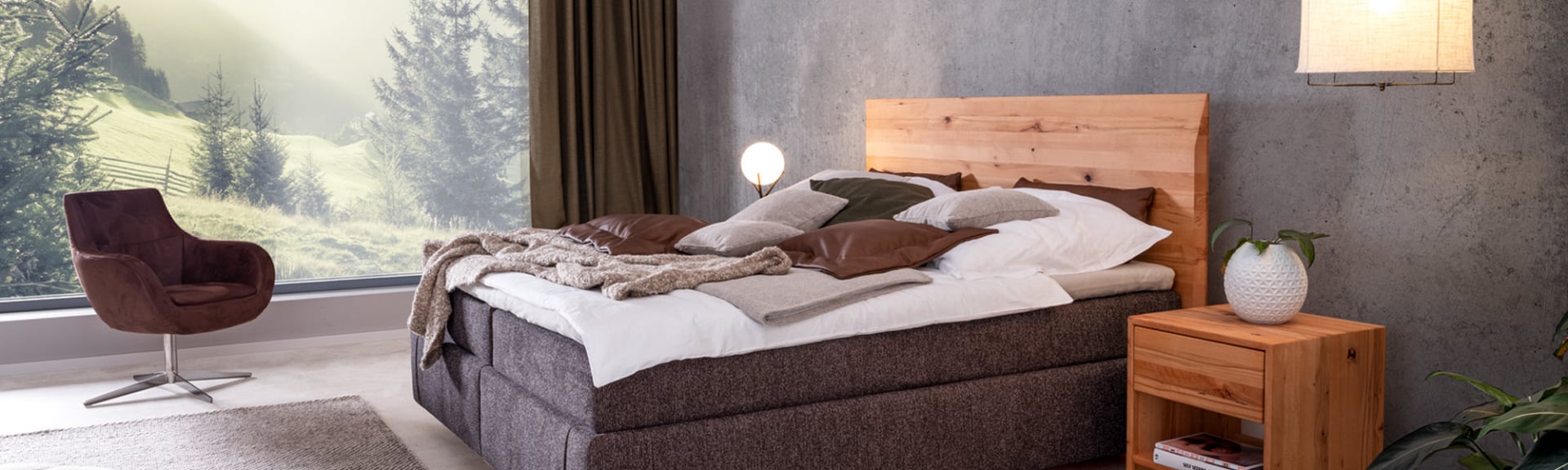 Mit unserem Boxspringbett STELLA ALPINA greifen wir diesen Wohntrend auf und kreieren ein harmonisches Vorzeigebeispiel dieses Stils. Exklusives Design, natürliches Flair und höchste Qualität – im Stil des alpinen Wohnens wird das Modell aus massivem Holz der Wildeiche, Wildkernbuche oder Zirbe gefertigt. Das Holz wird dabei so verarbeitet, wie der Baum ursprünglich gewachsen ist und behält seine Natürlichkeit und Einzigartigkeit. Wahlweise werden Kopfhaupt oder Box mit feinsten Stoffen und Ledern bezogen, während der jeweils andere Teil die Schönheit des Holzes offenbart. Im Zusammenspiel aus Design und Komfort, perfekter Verarbeitung und natürlichen Materialien entstehen Betten, die zu erholsamen Rückzugsorten und langjährigen Begleitern werden.