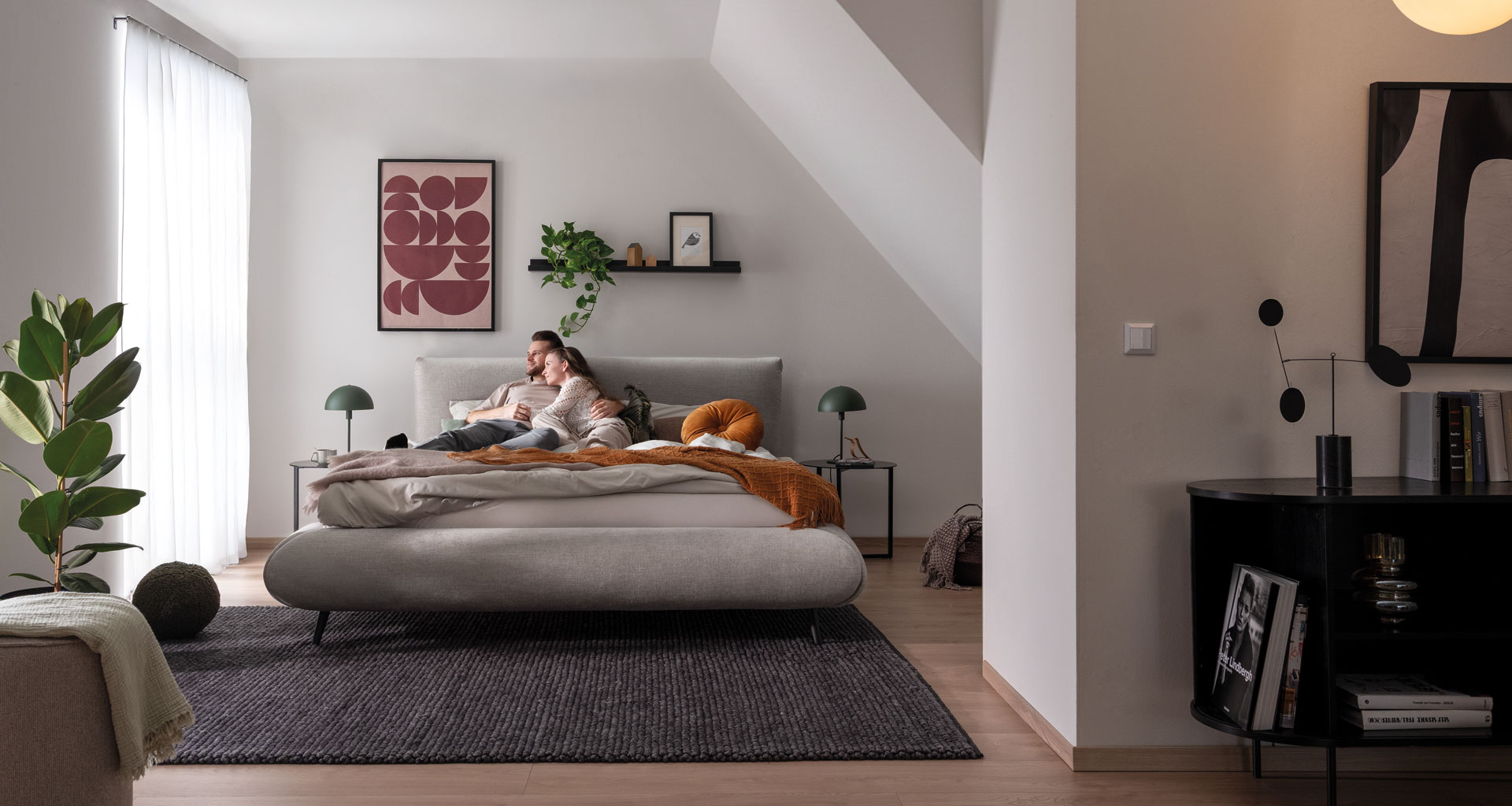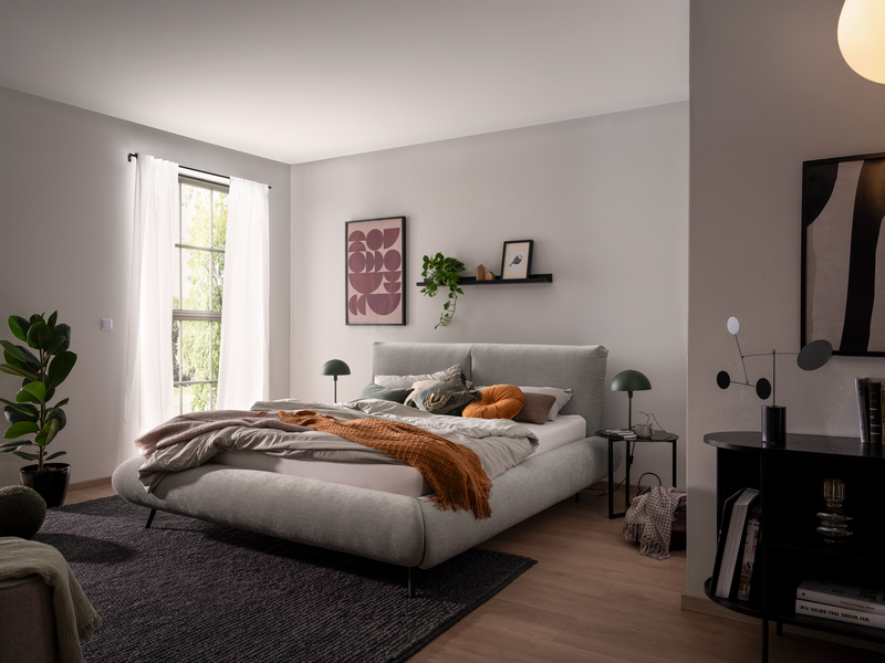 Willst du einfach ein Bett – oder deinen ganz persönlichen Rückzugsort? CALMATIO ist mehr. Sein weiches, abgerundetes Design wirkt wie eine Einladung zum Abschalten – gemütlich, harmonisch, ganz du. Du entscheidest: bodennahe Geborgenheit, wenn du es geerdet und ruhig magst, oder leicht erhöht auf 16 cm Füßen für mehr Leichtigkeit und Offenheit im Raum. Und für alle, die gerne Ordnung halten: Im optionalen Bettzeugraum verschwinden Lieblingsdecken und Polster ganz elegant – einfach praktisch, einfach schön.
