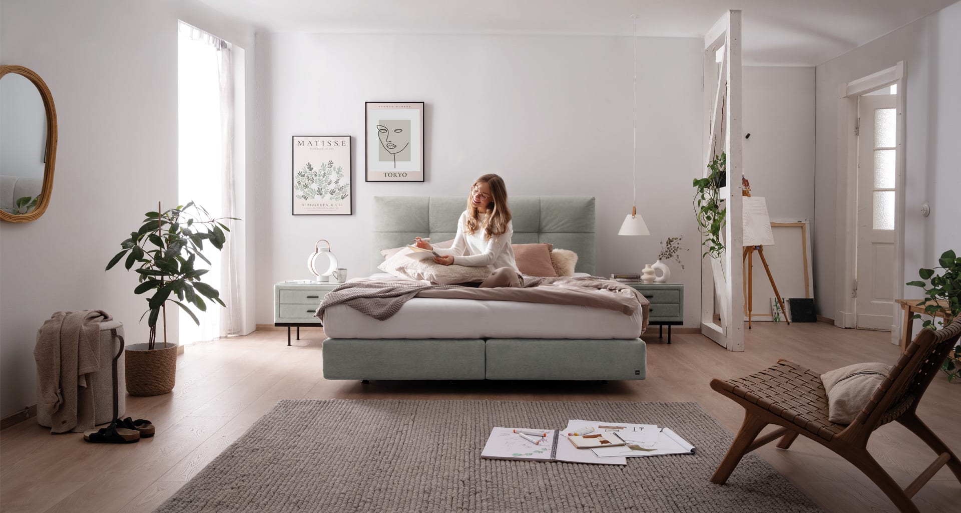 Dein Bett für ein gute Gewissen. Das Boxspringbett AMOENA hält, was sein Name verspricht: Es ist angenehm, sogar sehr angenehm! Dazu trägt vor allem die legere Polsterung des Kopfteiles bei. Für ein gutes Gewissen sorgt dieses Bett außerdem: Der Stoff ist aus recyceltem Material hergestellt und die Matratze ohne Verklebungen gefertigt – gut für dein Gewissen und die Umwelt. Apropos: Alle Teile des Bettes sind sortenrein trennbar und recyclebar. Dazu wird es allerdings nicht so schnell kommen, denn AMOENA ist hochwertig produziert und kann dich viele Jahre lang begleiten – das ist die wahre Nachhaltigkeit.