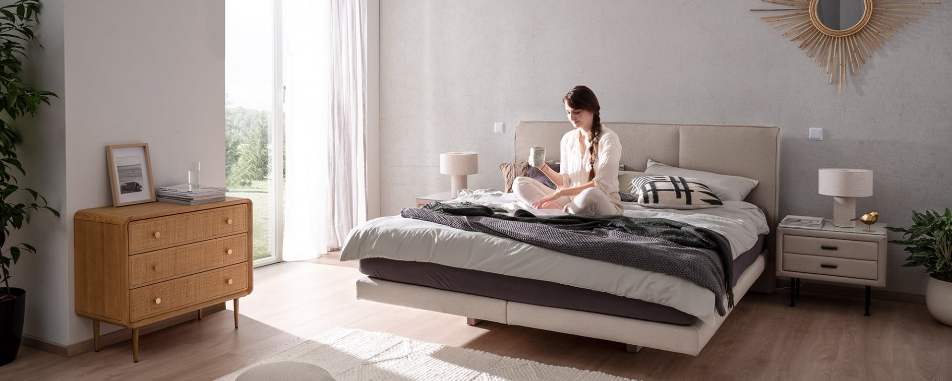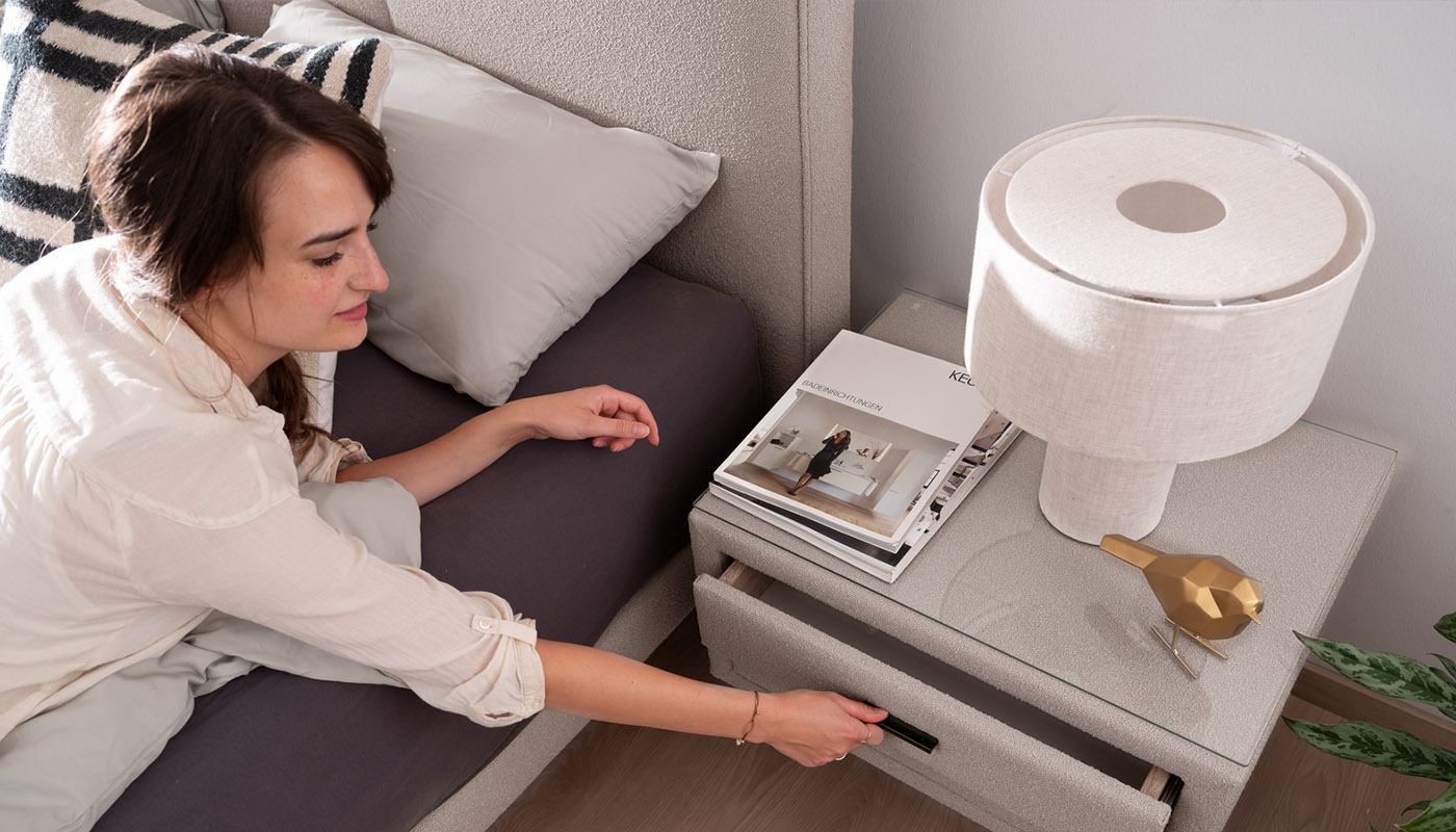 LEVIA bringt Leichtigkeit in dein Leben. Es ist ein Boxspringbett, wirkt im Design aber weniger wuchtig. Ein geradliniger Rahmen, abgerundete Konturen und die zurückgesetzten Beine sorgen für einen leichten schwebenden Eindruck – genau richtig für deinen Ausflug ins Traumland. Ein schönes Detail ist der Keder am Kopfteil: eine Verstärkung der Naht am Stoffrand, die händisch ausgeführt wird.