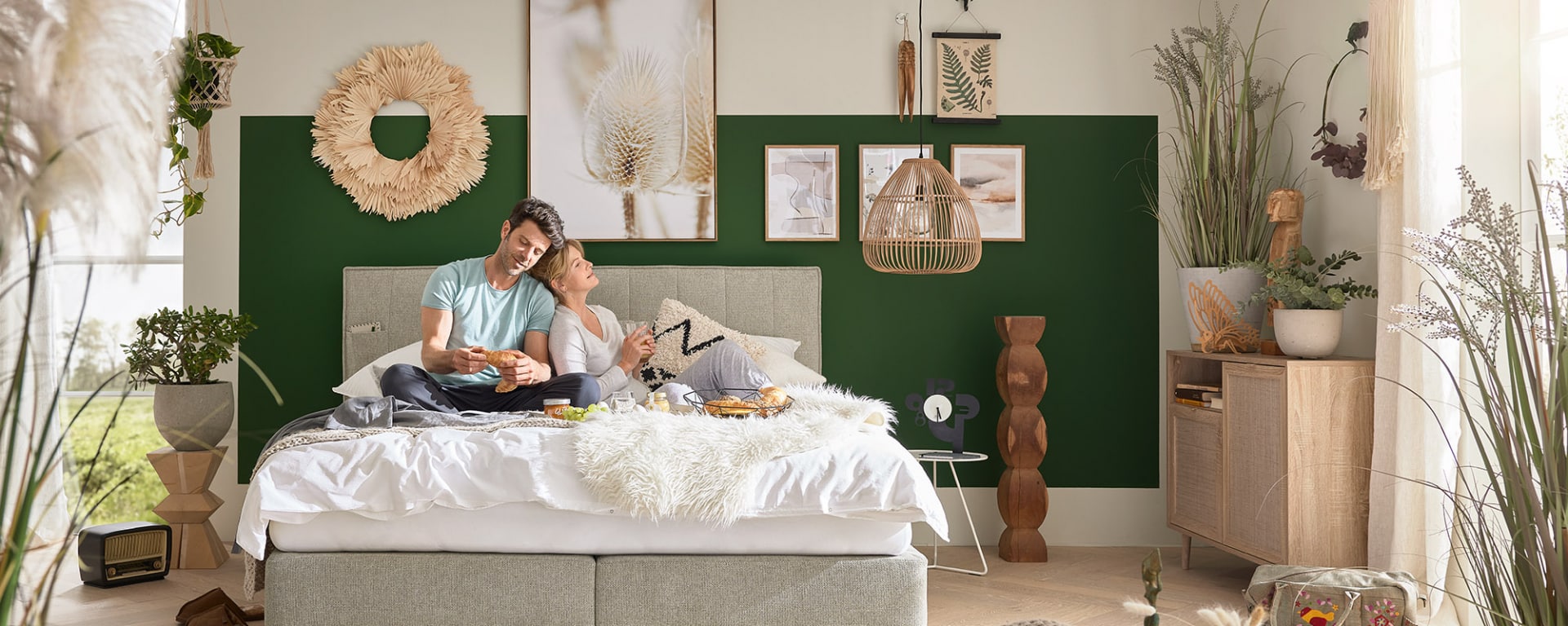 Das große Kopfteil mit der Polsterung fällt bei NIRINA als erstes ins Auge – ein charismatischer Auftritt und eine starke Schulter zum Anlehnen. Auch die ausladende Bettbox in der kubischen Form lädt zum Verweilen ein. Das Boxspringbett wirkt wie eine geruhsame Insel in deinem Schlafzimmer – schön! In den flachen Steckfächern auf beiden Seiten kannst du Dinge verstauen, die du für erholsame Stunden im Bett brauchst.